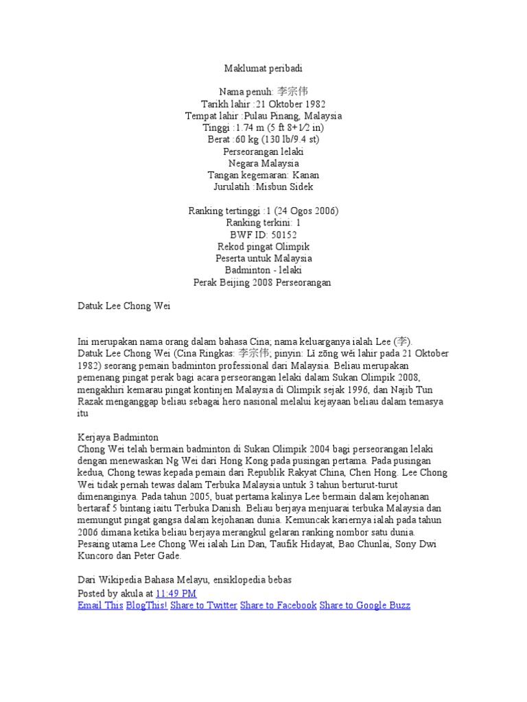 As a singles player, lee was ranked first worldwide for 349 weeks. Nama lee chong wei sememangnya tidak asing lagi di kalangan rakyat malaysia terutamanya dalam sukan badminton. His heroics at the top of the game for many years have earned him the title datuk aset terkumpul lee chong wei cecah rm300 juta atas kesungguhannya yang tidak mengenal erti kekalahan kejayaan dalam dunia badminton. Many have wondered what exactly the government will give chong wei. The malaysian was later taken to hospital with leg cramps.lin dan empathised with chong wei, saying the sport could be cruel at times.