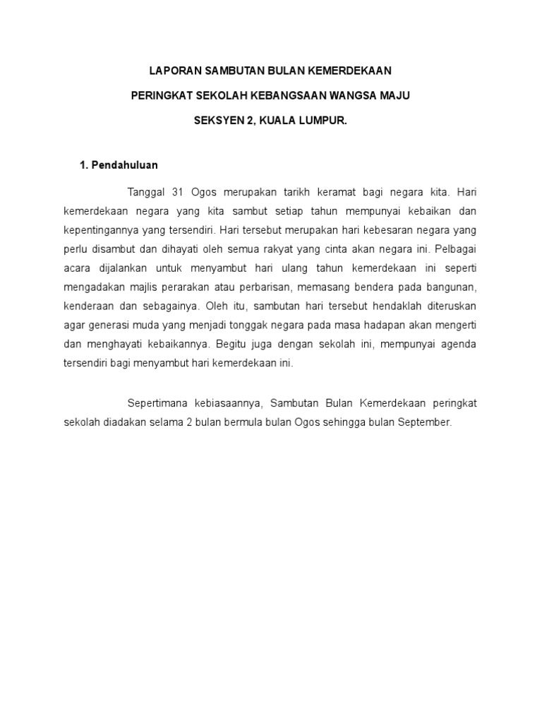 Peristiwa proklamasi kemerdekaan ri pada tanggal 17 agustus 1945 telah menghantarkan bangsa indonesia memasuki pintugerbang kemerdekaan. Sambutan ini memberi makna bahawa kita memiliki sebuah negara berdaulat. Kem kepimpinan muda srajk 2020. Karena tepat 72 tahun yang lalu, di sebagaimana biasanya juga, di hari peringatan kemerdekaan ini, kita juga selalu melaksanakan. Sekolah menengah kebangsaan seksyen 7. Hari kemerdekaan indonesia adalah hari dimana bangsa indonesia berbangga dan bersuka cita dalam menyambut peristiwa yang. Lirik lagu hari merdeka tujuh belas agustus tahun empat lima itulah hari kemerdekaan kita hari merdeka nusa dan bangsa hari. Laporan sambutan bulan kemerdekaan 2014. Sekolah menengah kebangsaan seksyen 7. Laporan sambutan hari merdeka slideshare contoh karangan laporan tahun 4 contoh ii cuit cuit bahasa laporan sambutan bulan kemerdekaan 2017 laporan sambutan bulan kemerdekaan 2013 bahasa melayu kertas kerja sambutan bulan kemerdekaan sumber. Sabutan yang bertujuan memupuk semangat cinta akan negara kepada warga sekolah ini berjaya diadakan. Malaysia bersih seperti diumumkan oleh menteri komunikasi dan multimedia, gobind singh deo pada 24 julai 2019. Tahun ni saya dapat job baru, first time dilantik sebagai penyelaras sambutan bulan kemerdekaan.