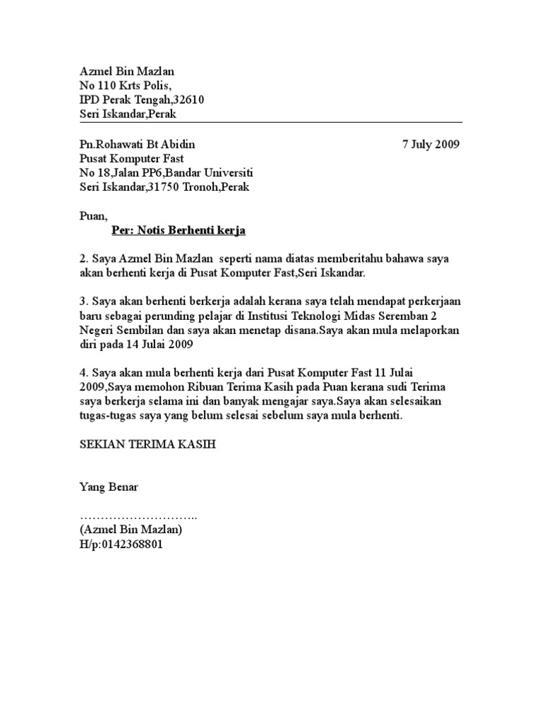 Hari ini motif.my akan share beberapa template dan contoh surat dibawah ini dikongsikan beberapa contoh surat berhenti kerja dalam tempoh notis sebulan dan juga 24 jam yang mudah dan ringkas. Merujuk kepada perkara di atas, saya ahmad farhan bin ahmad fuad, ingin memaklumkan kepada pihak tuan bahawa saya akan berhenti kerja mulai 31hb may 2010. Download contoh surat berhenti kerja notis sebulan. Kegagalan mematuhi tempoh ini akan dikenakan denda oleh majikan anda iaitu penalti wang setara dengan hari. Saya azmel bin mazlan seperti nama diatas memberitahu bahawa saya akan berhenti kerja di pusat komputer fast,seri iskandar.