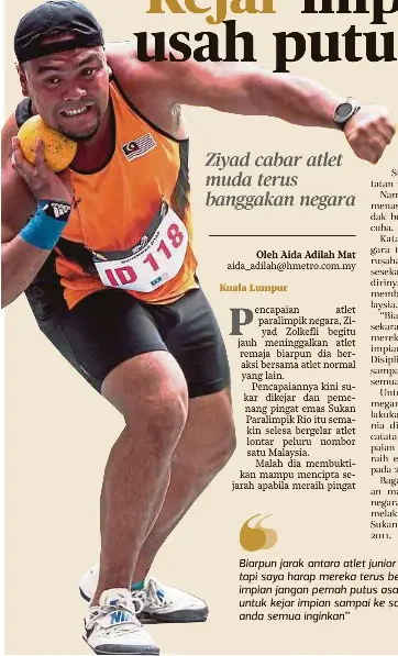 Itulah yang digambarkan oleh atlet lontar peluru paralimpik negara muhamad ziyad zolkefli apabila berjaya melakukan balingan 17 15 meter m pada sesi ujian di majlis sukan negara msn baru baru ini.