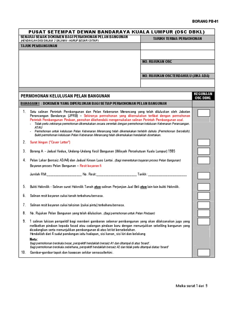 Pusat setempat dewan bandaraya kuala lumpur (osc dbkl) senarai semak dokumen bagi permohonan pelan bangunan.