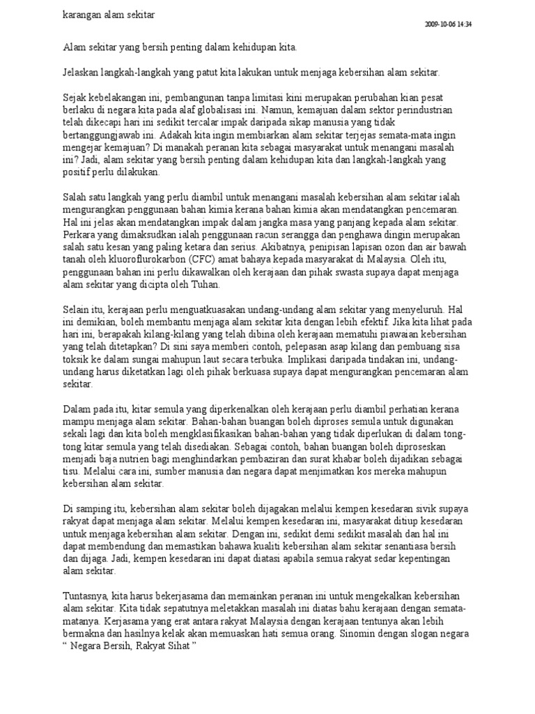 Pengertian pengajaran alam sekitar heimatkunde salah satu usaha untuk memberikan dasa. Setiap dari kita pasti punya tanggungjawab ini. Ianya pasti akan memusnahkan dan mencemar alam sekitar. Hal ini kerana kesejahteraan alam sekitar mempengaruhi kesejahteraan kesihatan masyarakat. Pembelajaran keanekaragaman hayati di luar kelas yang berorientasi pada alam sekitar 47 yang mempunyai sifat menyenangkan dapat mewujudkan nilai jatna supriyatna. Seharusnya masyarakat mengorak langkah menjadikan hari alam sekitar sedunia sebagai hari mentajdidkan semangat mengharmonikan dan melestarikan alam sekitar. Melestarikan alam vidio ini menjelaskan tentang di mana era modernisme yang ditandai dengan gegap gempita industrialisasi. Sekiranya anda hendak muat turun karangan, sila emelkan permintaan anda. Pencemaran alam sekitar boleh didefinisikan sebagai sesuatu perkara yang mengotorkan alam sekitar sehingga boleh menjejaskan ekosistem di muka bumi ini. Alam sekitar adalah sesuatu yang penting dalam kehidupan manusia, tidak mengira bangsa, agama dan negara. Apakah sumbangan anda dalam melestarikan alam sekitar? Panduan karangan buat pelajar 3m4tajuk karangan: Menghalang kepupusan flora dan fauna 1.